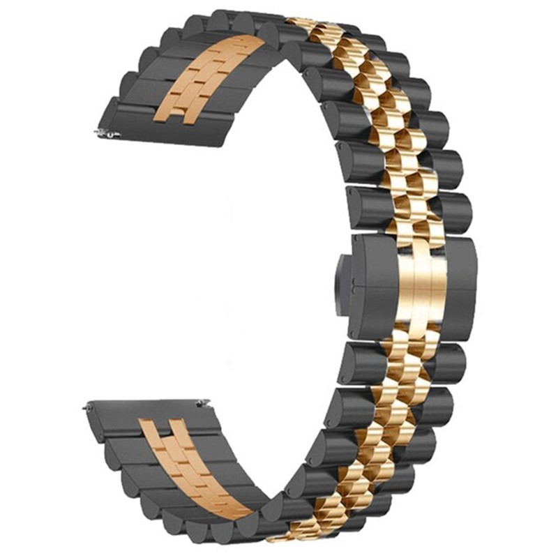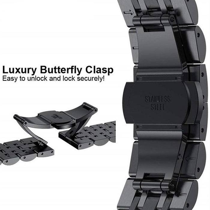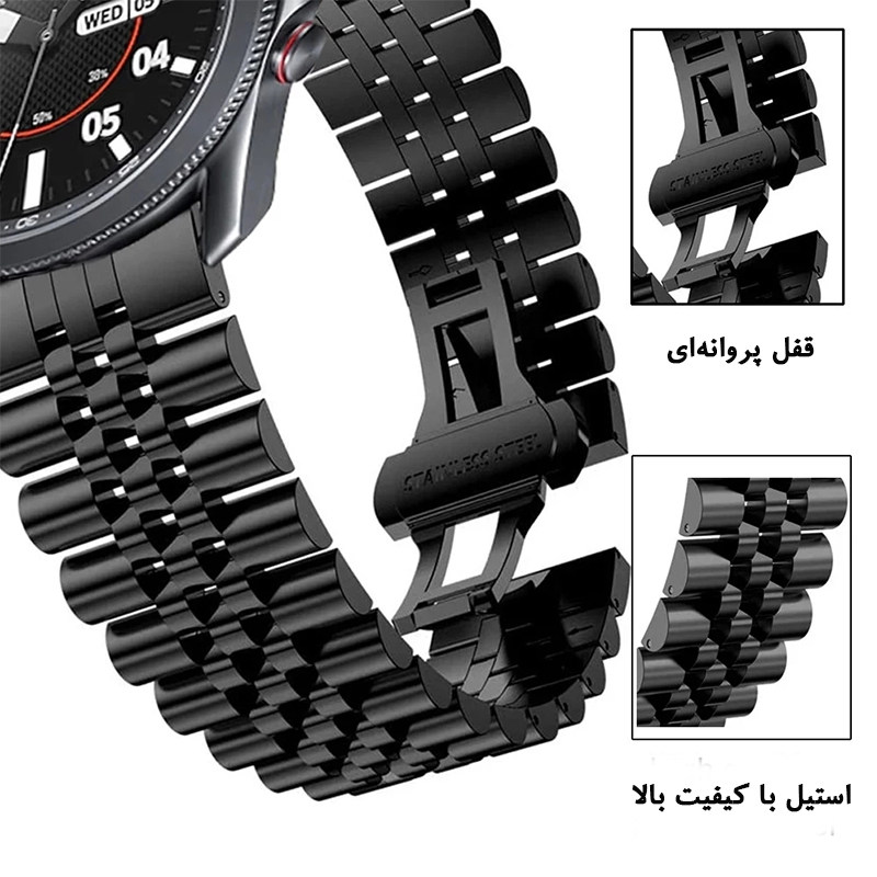 بند رولکسی فلزی مدل Texere 5B مناسب انواع ساعت های هوشمند بوده و هر نوع سلیقه ای را خوشنود و راضی می کند. بند فلزی ضد زنگ و ضد حساسیت آن این اطمینان را به شما می دهد که به مدت طولانی از آن بهره ببرید. برای تغییر بند ساعتتان به راحتی میتوانید پین های بند را باز کرده و بند را جا به جا کنید همچنین به راحتی میتوانید سایز آن را کوچک بزرگ کنید تا به سایز مناسب مچ دست شما برسد. این بند دارای قفل بسیار محکم میباشد که به راحتی باز نمیشود و از شل شدن ساعت دور دست شما جلوگیری میکند. سبک بودن و راحتی بند های Texere 5B از مزایای منحصر به فرد این بند هاست.